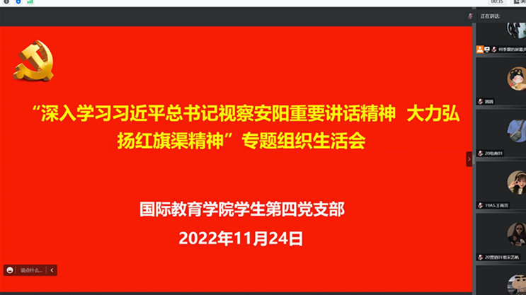 为深入学习宣传贯彻党的二十大精神和习近平总书记在河南安阳考察时重要讲话精神,按照上级党委安排部署,11月24日,我校学生第四党支部以线上会议形式召开了“深入学习习近平总书记视察安阳重要讲话精神,大力弘扬红旗渠精神”专题组织生活会。副院长邓瑜以普通党员身份参加并指导组织生活会。会议由党支部书记何季霖主持,支部全体党员参加会议。