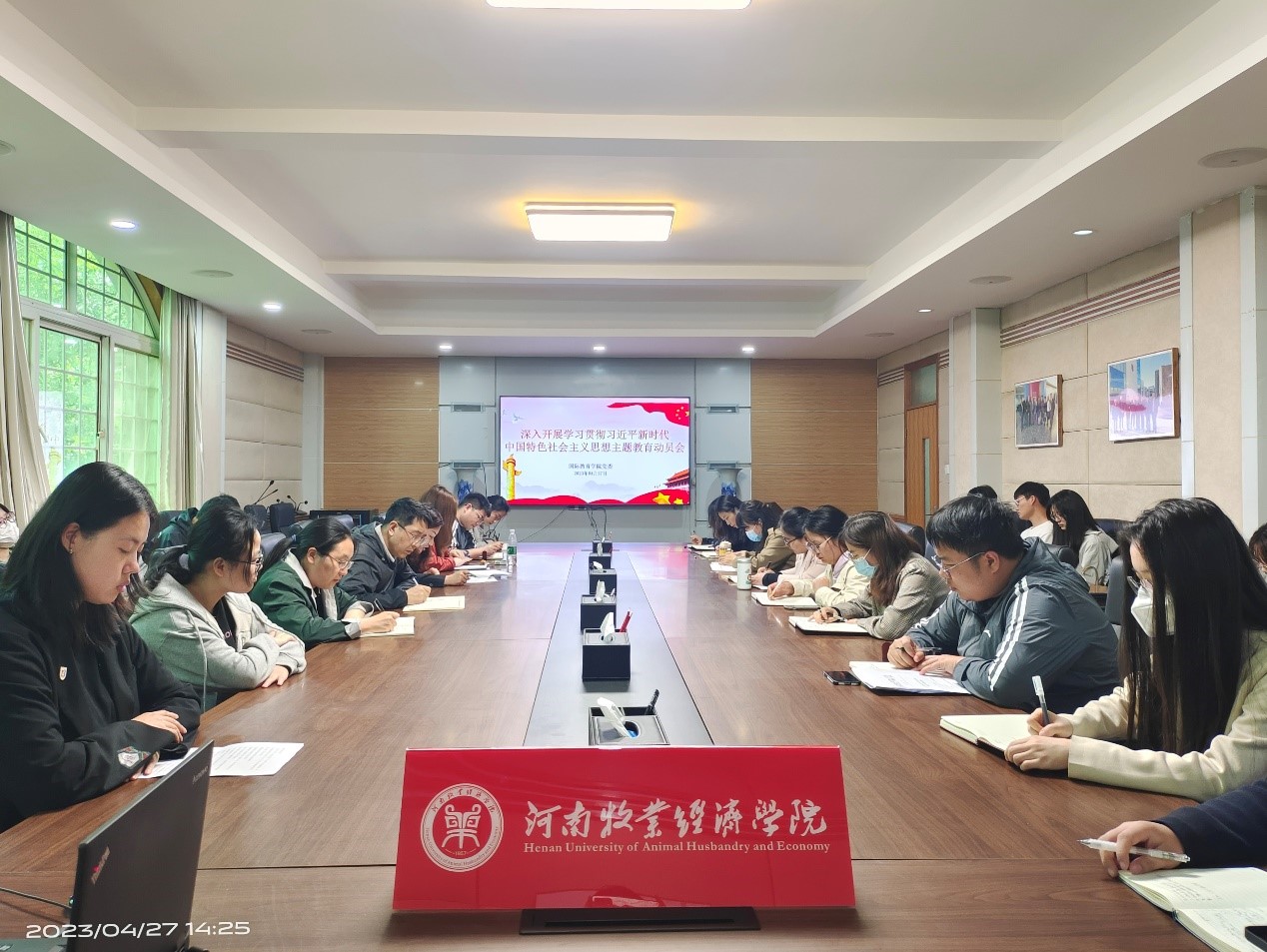 4月27日下午,beat365最新版2022在教学办公楼113会议室召开深入开展学习贯彻习近平新时代中国特色社会主义思想主题教育动员会。院党委书记贾江主持会议并作动员讲话。全体教工党员、部分学生党员代表参加会议。
